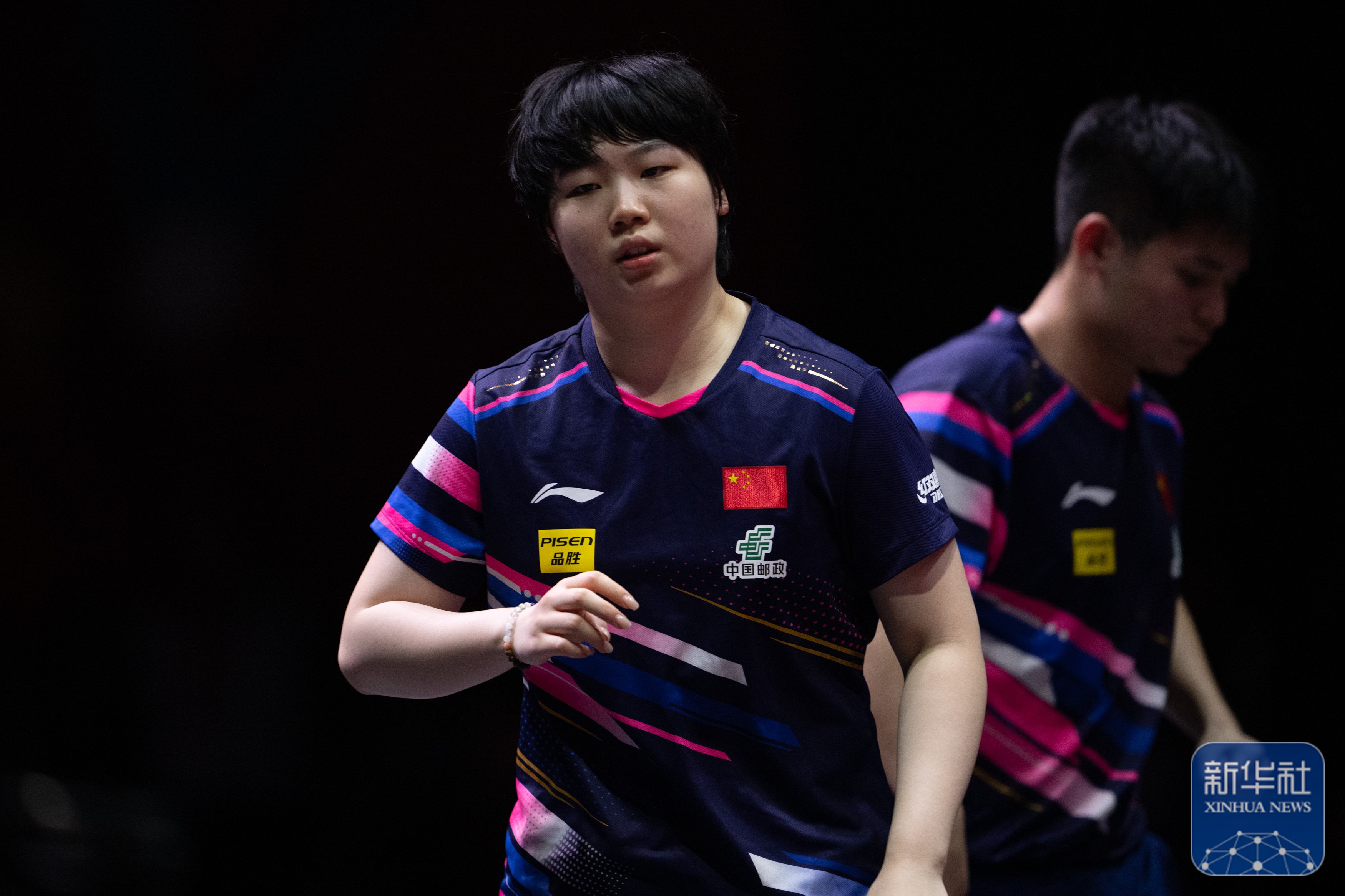 ↑ 林诗栋(右)/蒯曼在比赛中准备接发球。新华社记者 肖艺九 摄