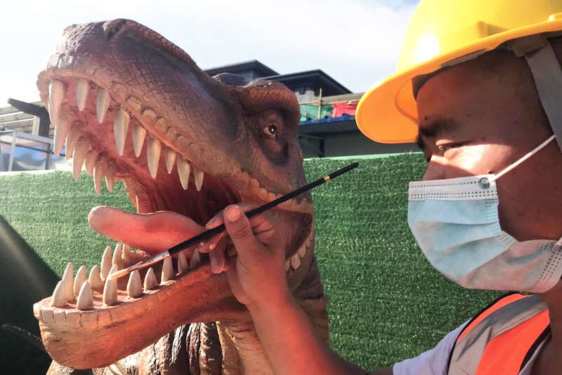 艺术彩绘班组对乐园的恐龙作上色处理。