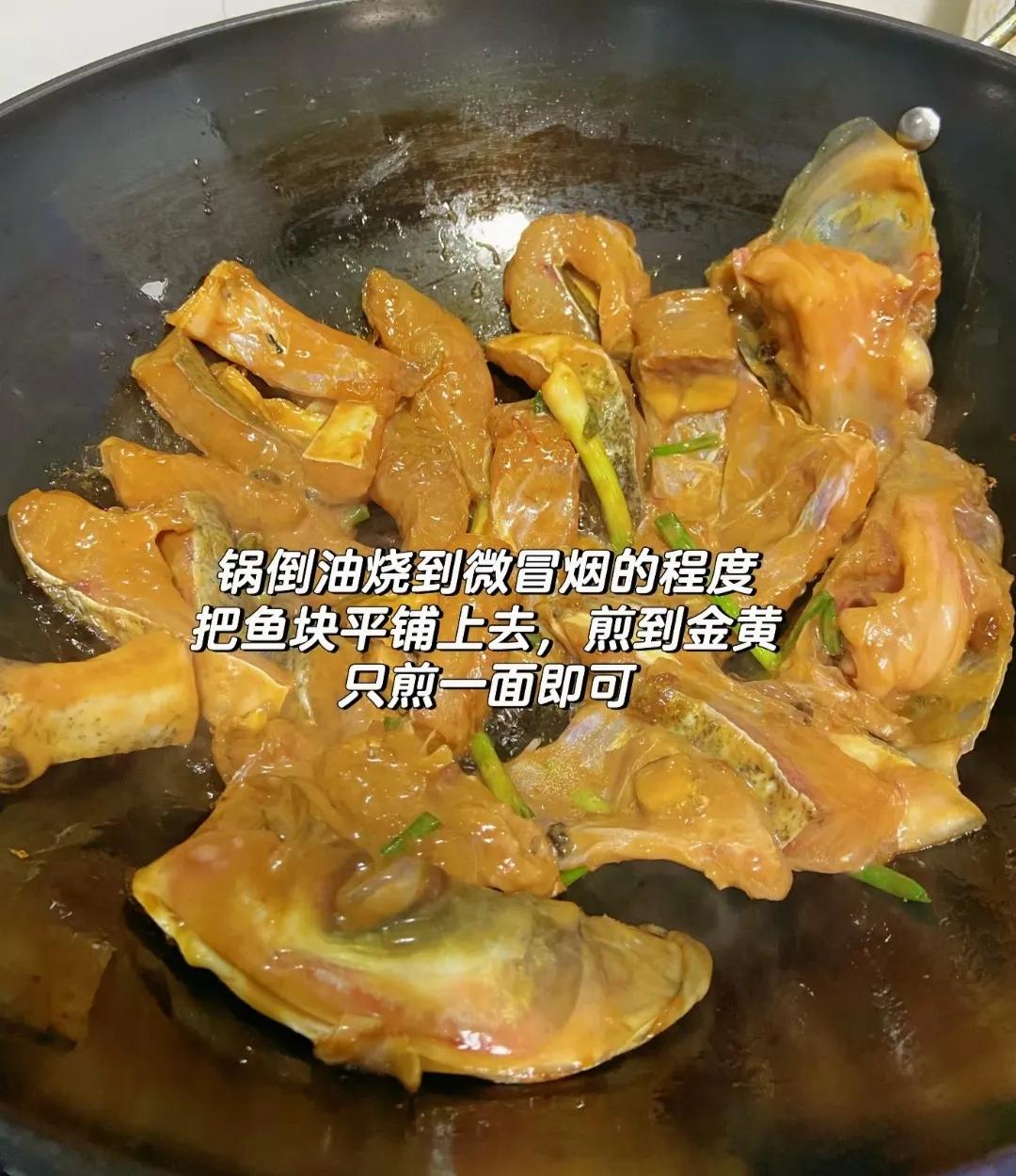 锅里烧油到微微冒烟,把鱼块铺下去,不要翻动,煎至金黄~