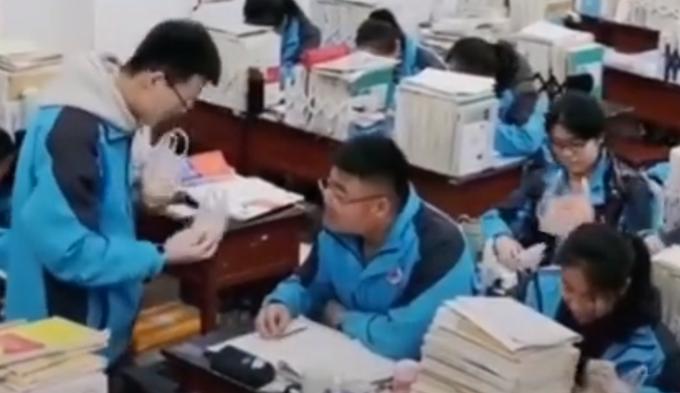 视频中,男生双手提满帮同学带的餐,嘴里还叼着几份,小碎步跑进教室,随后,分给正在教室学习的同学。班主任莫老师表示,这些学生都是班里的尖子生,因为高三学习紧张,所以他们轮流帮忙带饭节省时间。