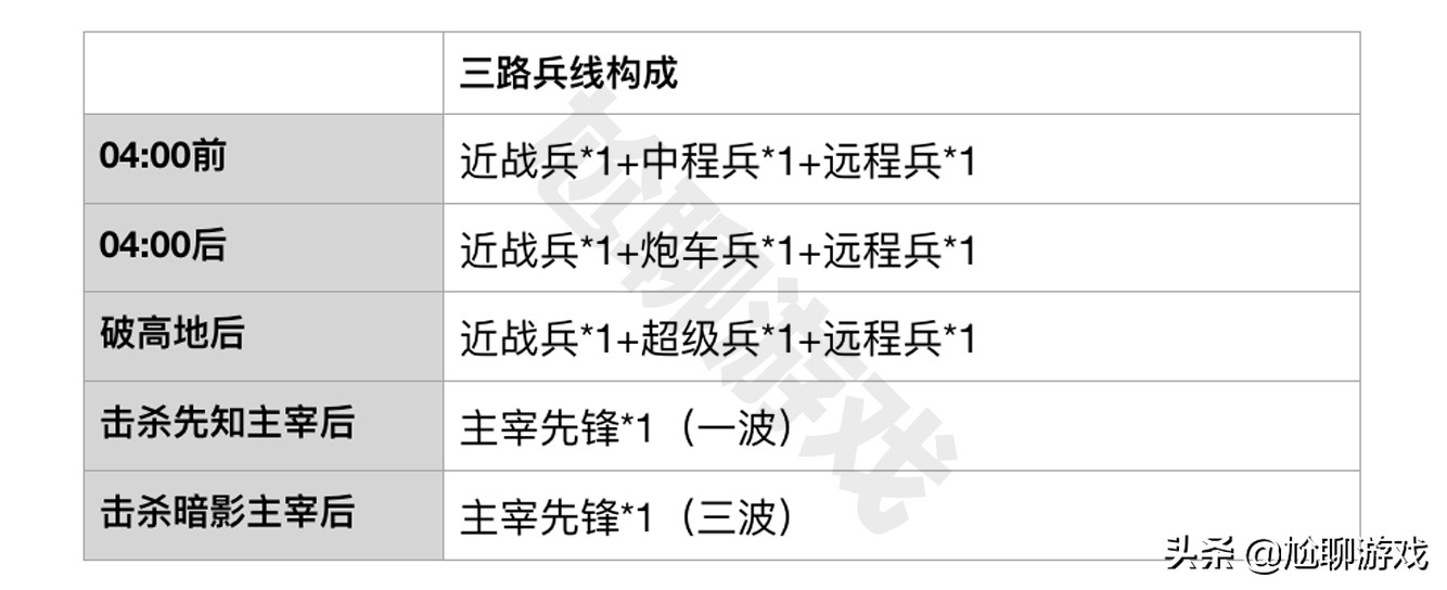 同时,每一波兵线的兵种构成随时间推移进行调整,但整体保持三路一致。