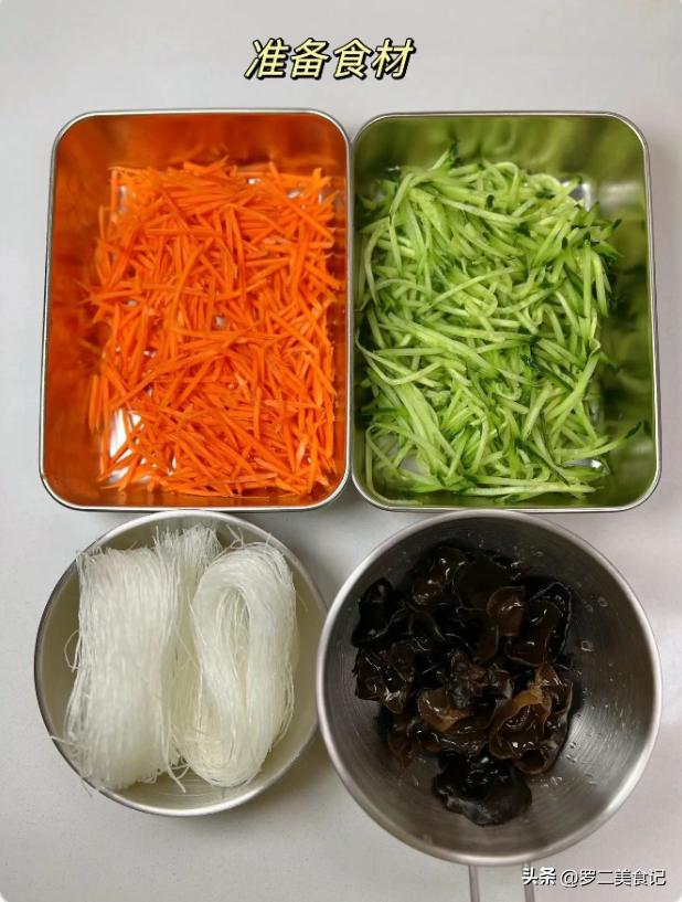 材料:适量胡萝卜,适量黄瓜丝,一把粉丝,一把木耳,秘制料汁。