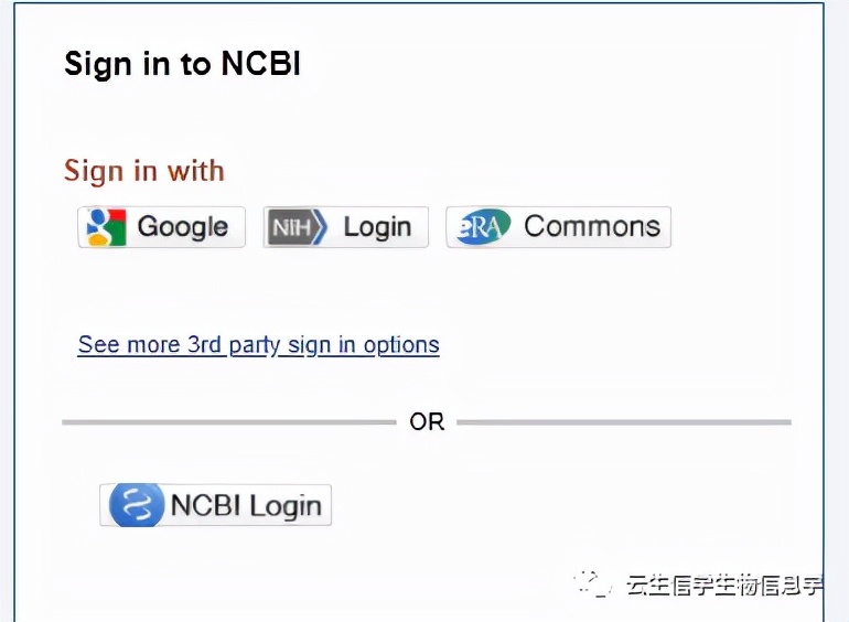 但是自从2021年6月1日之后,NCBI就不提供直接的注册页面(即之前只需要提供用户名和密码)的形式,开始提供需要第三方账号登录的形式,包括下面这几种: