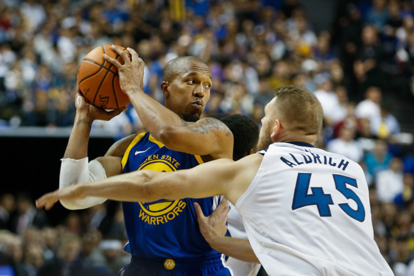 勇士队韦斯特被森林狼队科尔·阿尔德里奇严防。