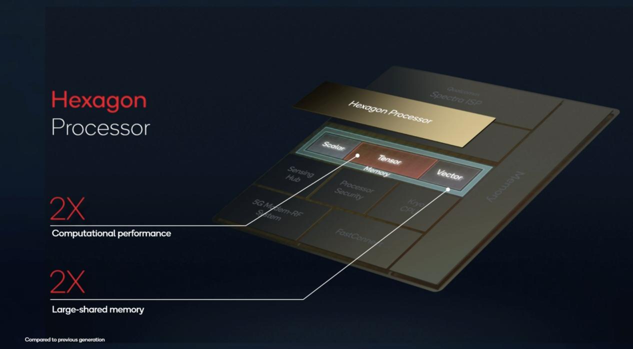 第七代 AI Engine 能够实现如此量级的提升,很大程度上得益于 AI 软件性能的提升。除了 Hexagon 处理器性能翻倍,其 AI 软件性能也提升了 2 倍。