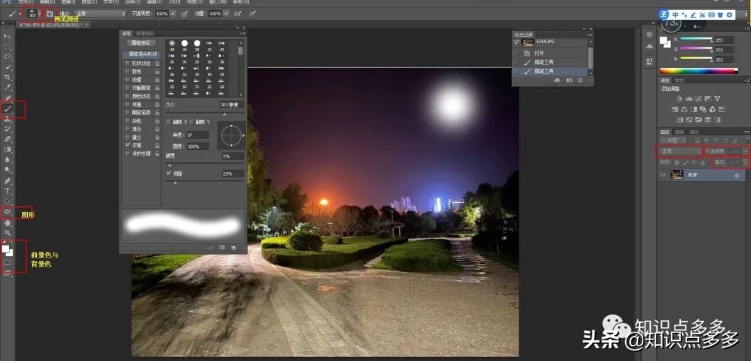 用以上第二步骤,选择画笔,一般选择白色,同样可以通过,下图中图层:不透明度或者填充,或者将图层正常改为柔光或者其他(调整亮度)。点一下就可以了,然后移动到哪里就行手电筒一样。