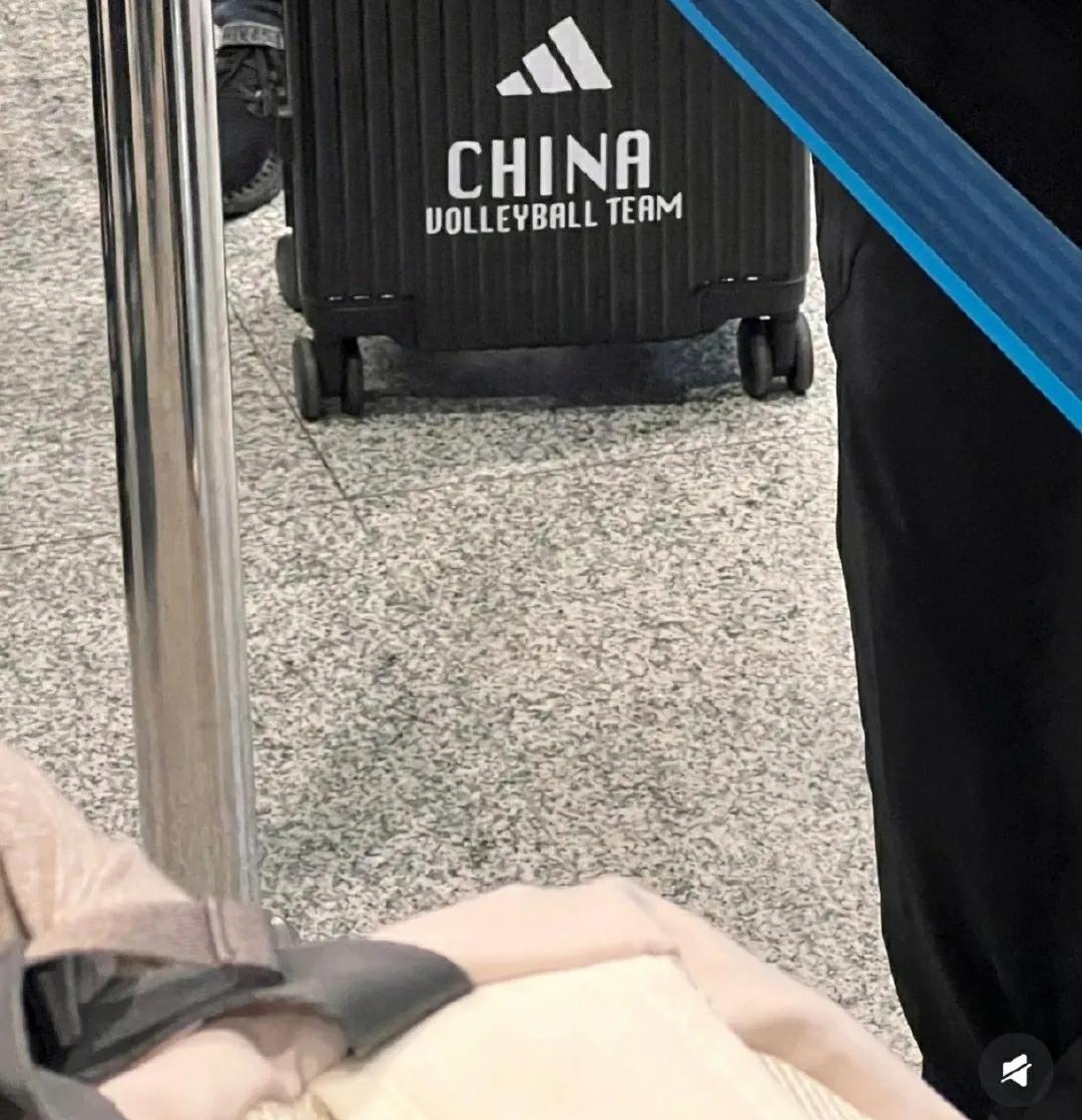球迷不好意思直接拍摄中国女排的队员和教练员们,配图拍照的是中国女排的专用行李箱,箱子上面是中国女排的英文文字。