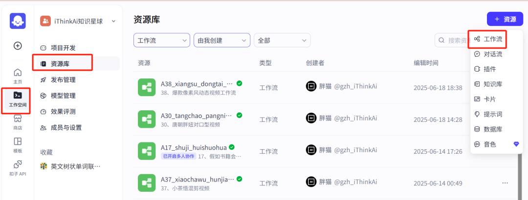 首先新建一个工作流,点击「资源库」,然后选择工作流。