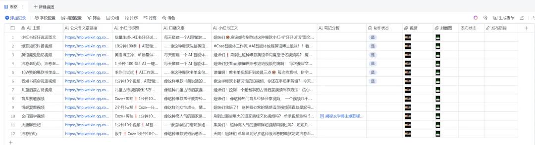 不仅如此,可以这个Coze智能体工作流发布到飞书多维表格,还可以在表格上直接调用智能体,批量生成视频。
