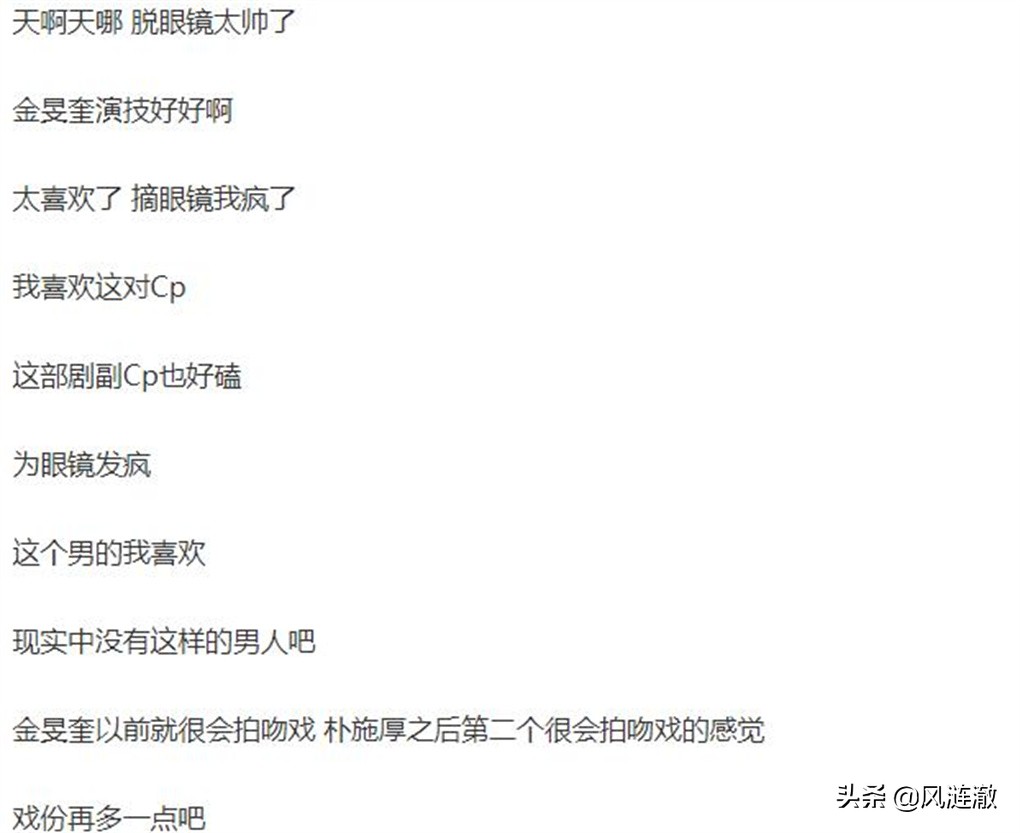 没想到眼镜吻戏播出后,却引发了网友们的热烈讨论,有人夸金旻奎脱眼镜太帅了,有人称赞金旻奎演技太好了,有人大赞金旻奎和薛仁雅的化学反应绝了,有人哀叹现实中没有成勋这样的男人吧,还有人希望金旻奎和薛仁雅的戏份能再多一些……