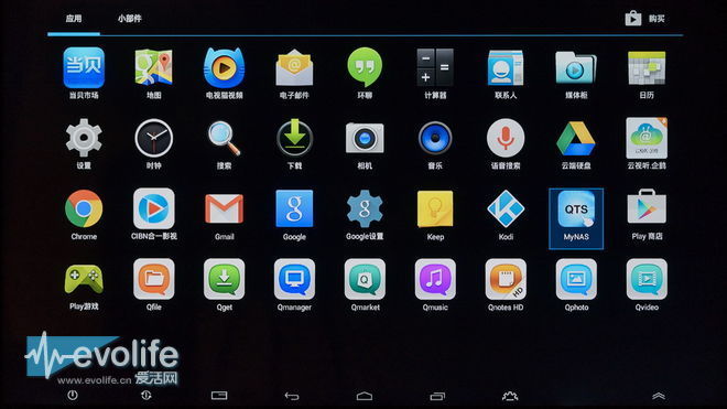 通过HDMI输出到电视的Android 4.4系统已经对大屏幕进行了优化,绝大部分操作都可以通过遥控器实现。威联通提供了Photo照片、Music音乐、Video视频三大类基础功能。而附带的Qmarket商店内还有Kodi等热门软件。为了符合国情,Qmarket内还有当贝市场等多个中国应用商店,我们安装了当贝市场后,就可以直接安装腾讯视频、优酷视频、爱奇艺等针对机顶盒设计的App。