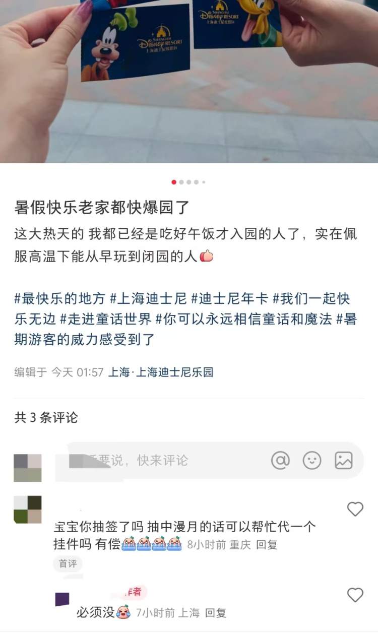当天,她在小红书上晒出自己的一日票,立刻有人留言,“你抽签了吗?抽中漫月的话可以帮忙带一个挂件吗?有偿。”