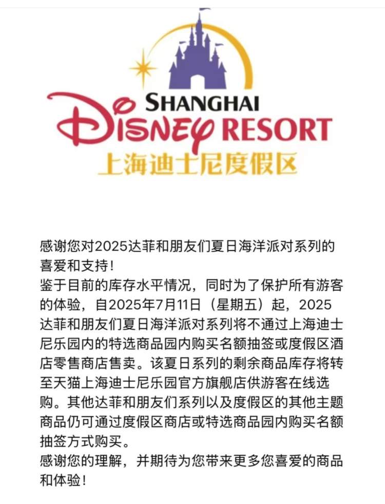 然而,7月10日,来自上海迪士尼度假区的官方公告,彻底终结了夜排的“盛况”。公告上写着,“鉴于目前的库存水平情况,同时为了保护所有游客的体验,自2025年7月11日(星期五)起,2025达菲和朋友们夏日海洋派对系列将不通过上海迪士尼乐园内的特选商品园内购买名额抽签或度假区酒店零售商店售卖。该夏日系列的剩余商品库存将转至天猫上海迪士尼乐园官方旗舰店供游客在线选购。”