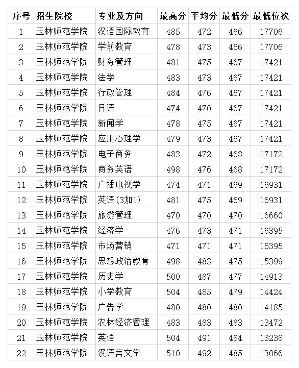 玉林师范学院2020年本科二批普通类专业录取分数线(区内文科)