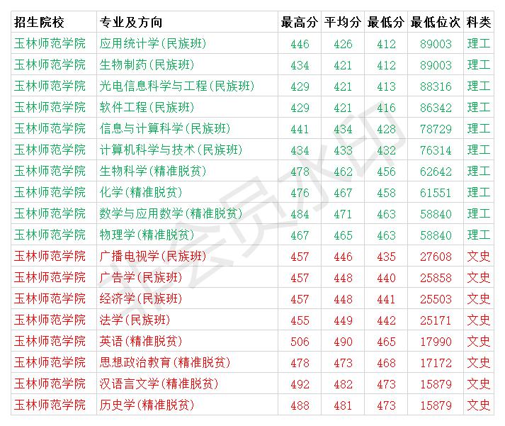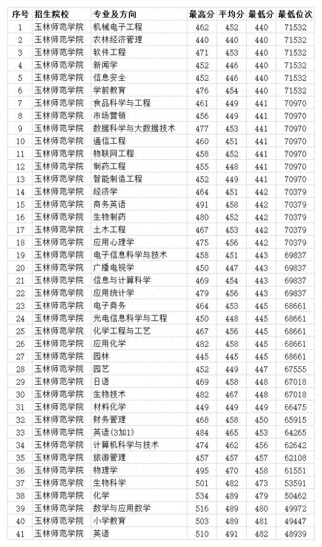 玉林师范学院2020年各专业录取分数线 本科理科最低440分