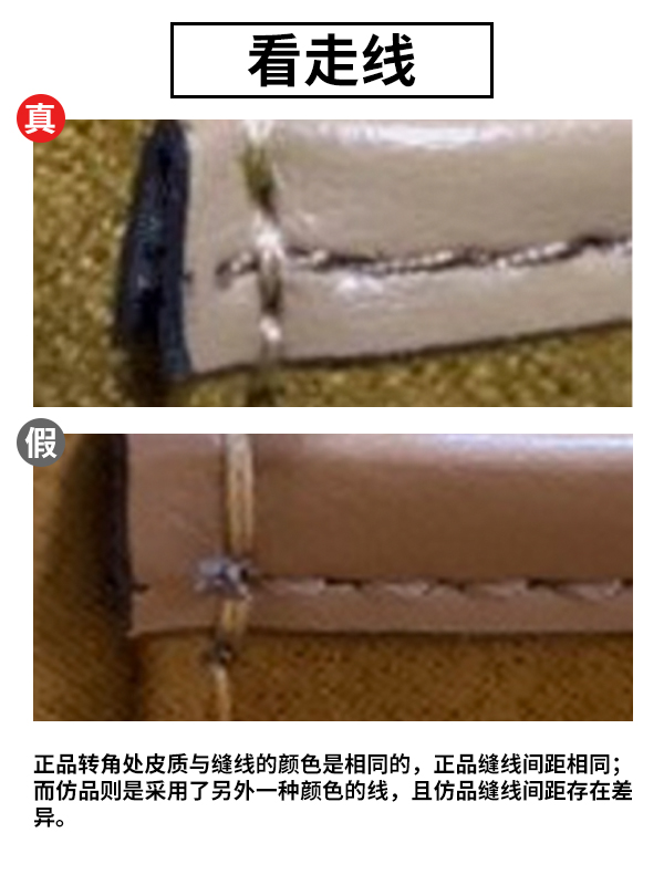 正品转角处皮质与缝线的颜色是相同的,正品缝线间距相同;而仿品则是采用了另外一种颜色的线,且仿品缝线间距存在差异。