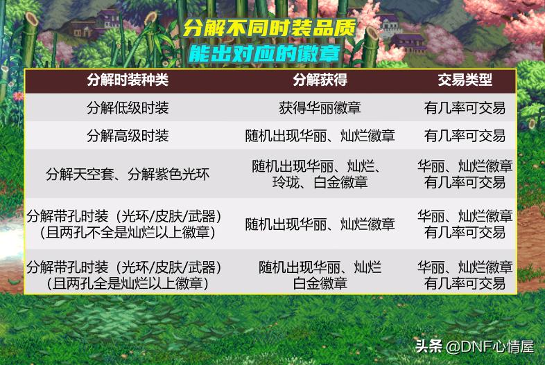 分解高级时装,会出现华丽和灿烂徽章,有一定几率转化为可交易。灿烂还挺香的,角色“第一页”专属,能升级成玲珑品质。分解天空、紫色光环装扮,能随机出华丽、灿烂、玲珑和白金徽章,华丽和灿烂可交易,但玲珑和白金不行。