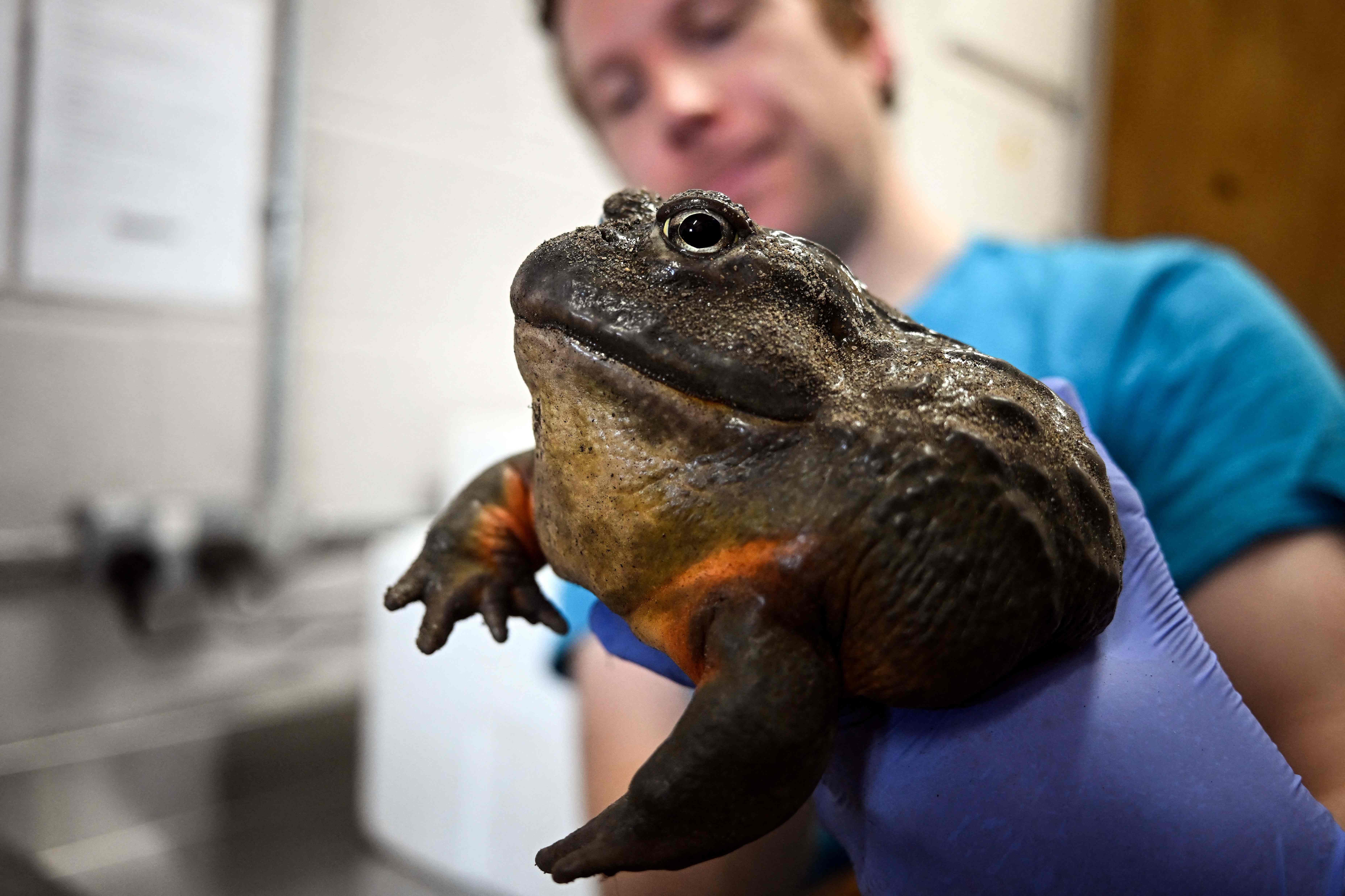 3月31日,在英国切斯特动物园举行的全新“非洲之心”展区预展上,非洲牛蛙“特雷弗”正在称重。新华社/法新