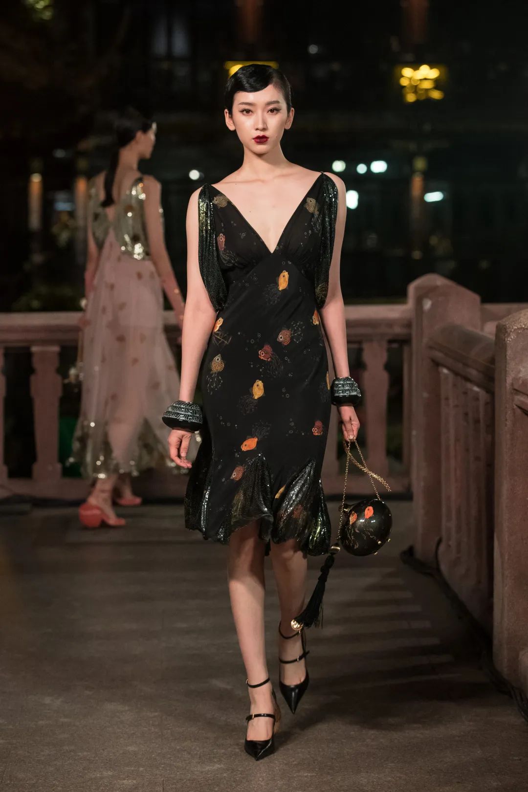 本季Lanvin不仅将金鱼作为印花展现于服装上,就连Minaudiere手袋也被制作成鱼缸的形状。这其中自有中国文化的寓意,Lanvin以优雅、乐观以及生活乐趣的精神来到一个全新的地点、全新的时代。
