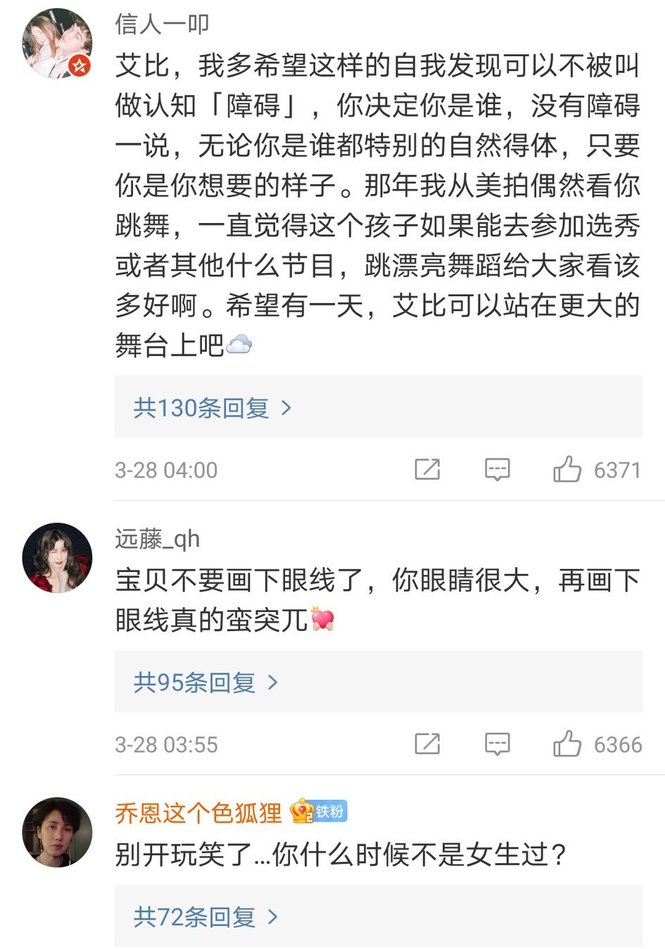 很多粉丝更是在评论区替艾比打气,部分网友还觉得艾比推动了LGBT群体进步,鼓励更多的群体站出来勇敢做自己。