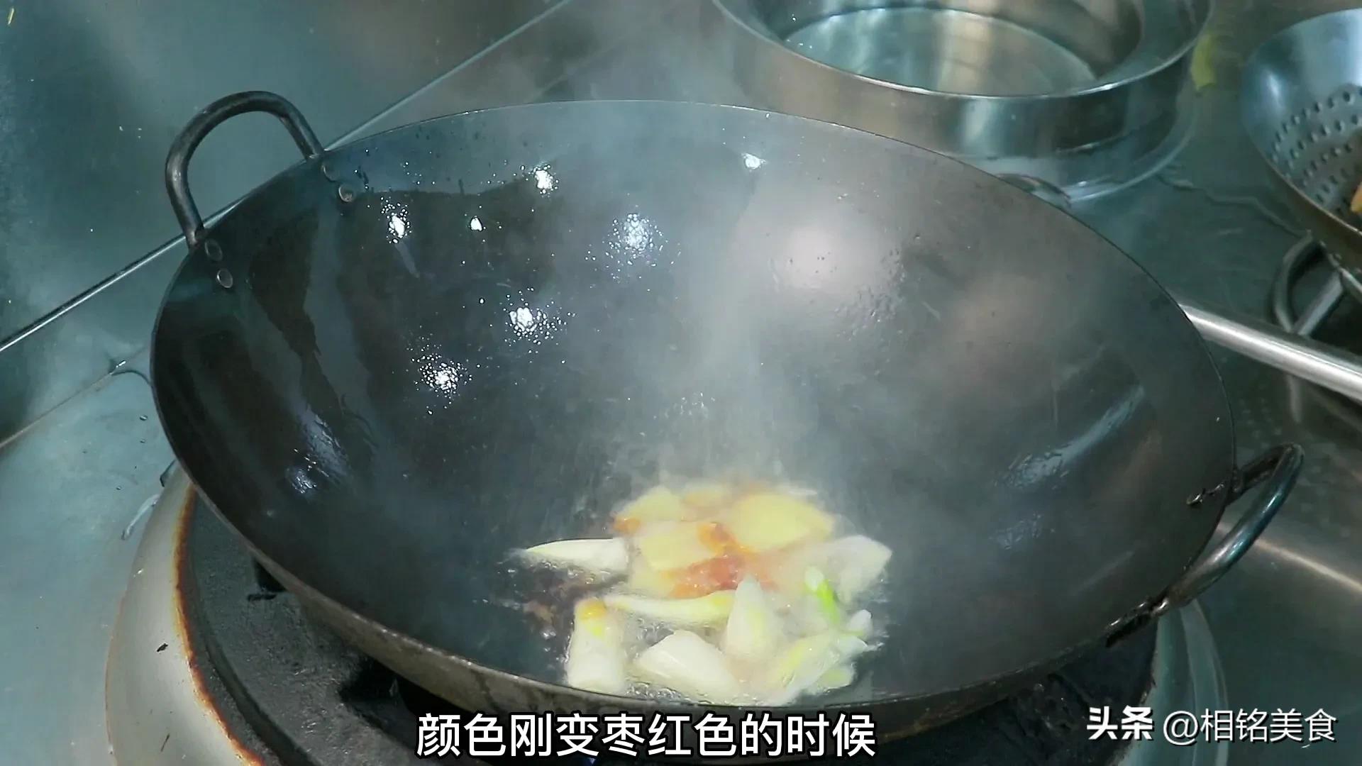 锅里放油,下入冰糖炒糖色,颜色刚变枣红色的时候,下入葱姜激发出香味,然后香料下锅,炒出香味以后往锅里加水;