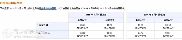 月度库存储存费用(MonthlyInventory Storage Fee):我们将针对标准尺寸商品和超大尺寸商品调整月度库存储存费用,2016 年 3 月 1 日生效。此次变更将首先表现在 2016 年 4 月收取的2016 年 3 月的储存费用中。