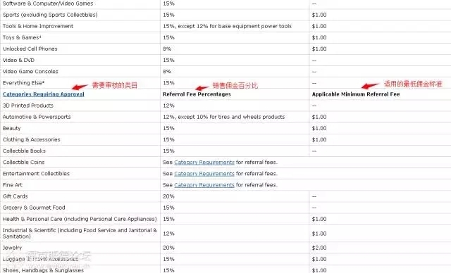 就可以看到具体的产品佣金的收费标准,各个类目的佣金比例和最低的收费标准。以下是英国站产品佣金的收费标准,查询的方法也是一样的,具体如下: