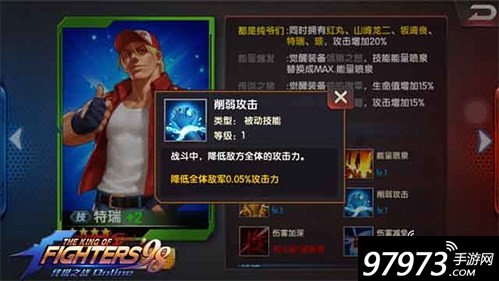 3。特瑞:这名格斗家在《拳皇98终极之战OL》的路上可谓曲折,早些时候的版本,特瑞是真真正正的先手之王,必杀能量喷泉的高输出高控制,让其成为与罗伯特齐名的2大平民神卡。之后,特瑞被大砍一刀,没觉醒之前控制和伤害降低,沉寂了一段时间,直到疯八出来以后,他又成为目前优先考虑的四魂阵容之蛇,因为他的被动技能—削弱攻击,百分比降攻就问你怕不怕,并且,被动降攻和必杀降攻还能叠加!获得来源也容易,酒吧抽将和精英副本。