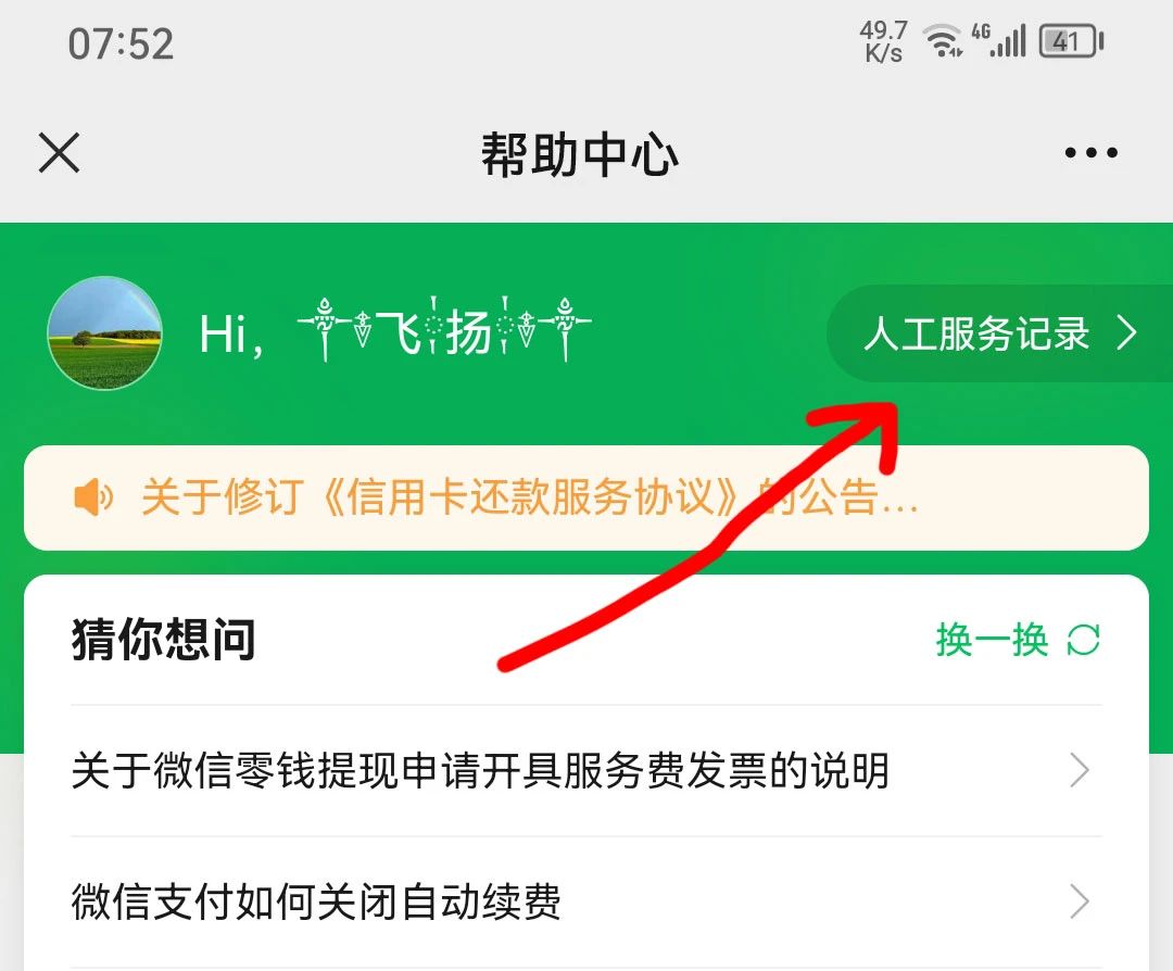 接下来在这个页面的右上角点击【人工服务记录】。可以看到在页面的下方有一个【我的自动扣费】的选项。