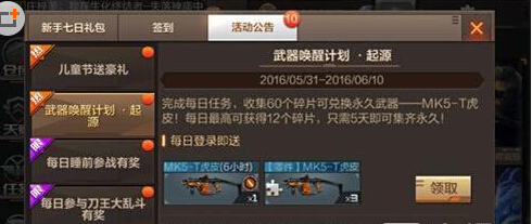 每日登录即送:直接领取系统赠送的武器(使用时间6小时),以及武器零件。