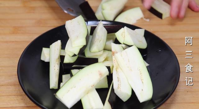 1.首先,我们将茄子洗净后,切成下图这样的长条状,然后放在一旁待用。