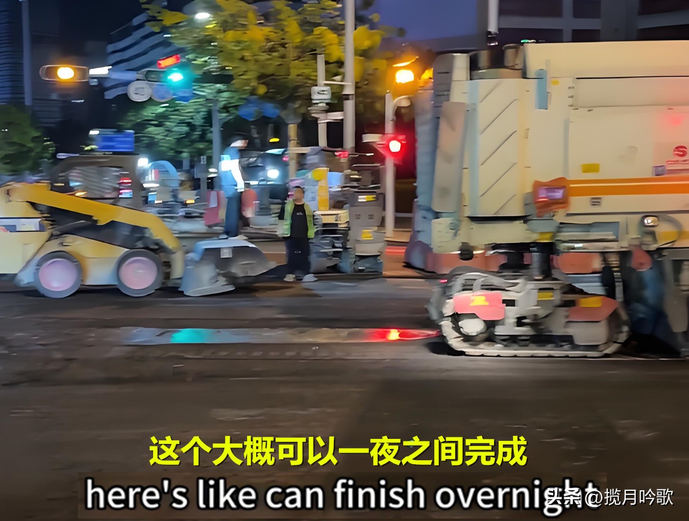 “现在是凌晨3点22分,并且这是个周末,而他们现在在维修道路,为了不打扰白天的交通,他们一整夜都在维修这段道路。