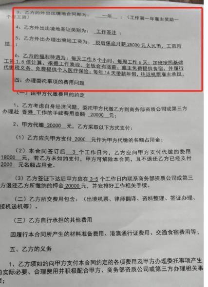 这份协议中提到,招聘“电工、电焊工”到中国香港务工,合同期为一年,出境地工资为税后保底月薪3万—4.5万元人民币,工资月结,由代理人代领,“每天工作8个小时、每周工作6天,加班按照基础工资1.5倍计算,免费提供食宿,免费提供个人医疗保险,每年14天带薪年假……”