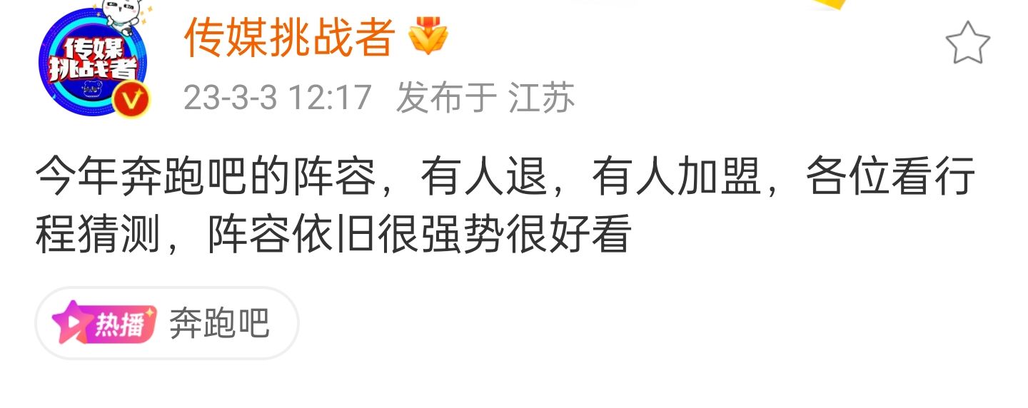 总之今年谣言特别多的情况下,阵容估计会调整一下了,但是于《奔跑吧》而言是好事,节目还没播出,热度就起飞了,有点像《中国好声音》导师官宣一样了。