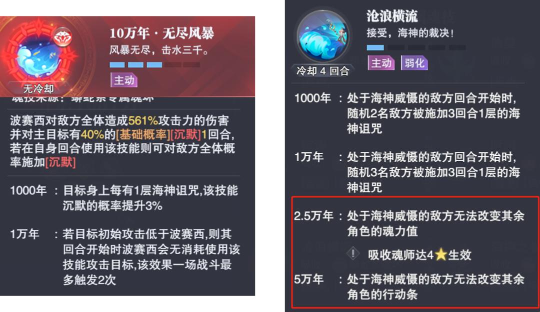其次【海神威慑】的第二个和第三个作用便是让处于此状态下的人无法对友方进行拉条和回能,最多持续3回合(专属头骨基础效果),利用这个功能,当我们对敌方的如宁荣荣、奥斯卡等辅助魂师使用此技能时,基本上他们就会被至少废掉3个回合......这也是为何波赛西在PVP中会如此强势的原因之一。