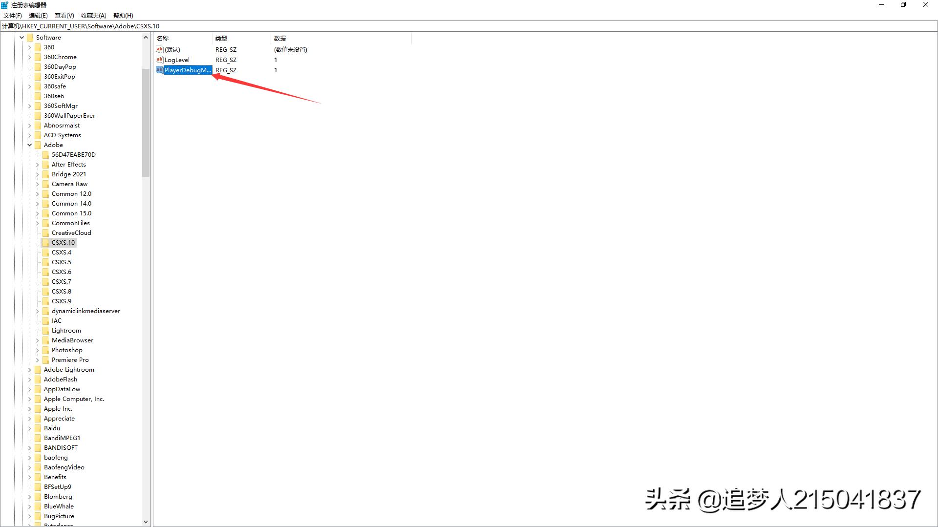 6. 打开CSXS.10文件夹后,在窗口右边空白的地方鼠标右键新建一个字符串值,命名为PlayerDebugMode,如下图: