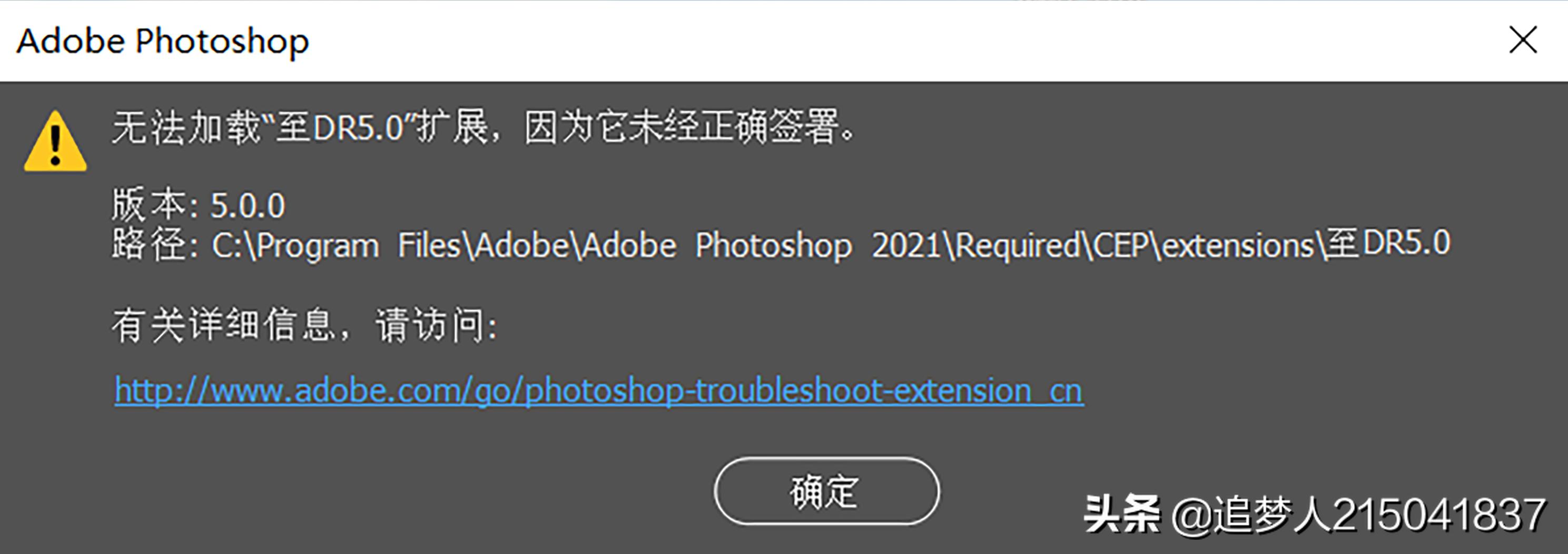 PS安装DR5插件显示无法加载"至DR5.0"扩展,因为它未经正确签署。版本:5.0.0路径:C:\Program Files\AdobelAdobe Photoshop 2021Required(CEP\extensions至DR5.0,下面以图说下PS2021不能安装DR5插件的设置方法。