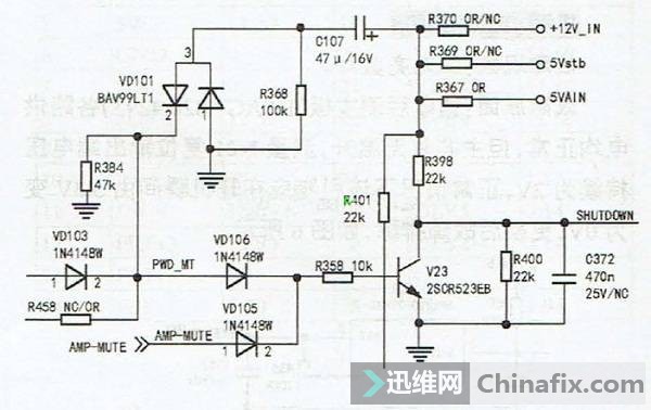 原因:此种故障系主板漏电所致,将静音电路中的VD106二极管负极电路断开可修。
