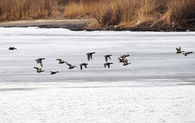 ↓↓渐化的江面,几只从南方迁徙回的野鸭在江水中嬉戏。
