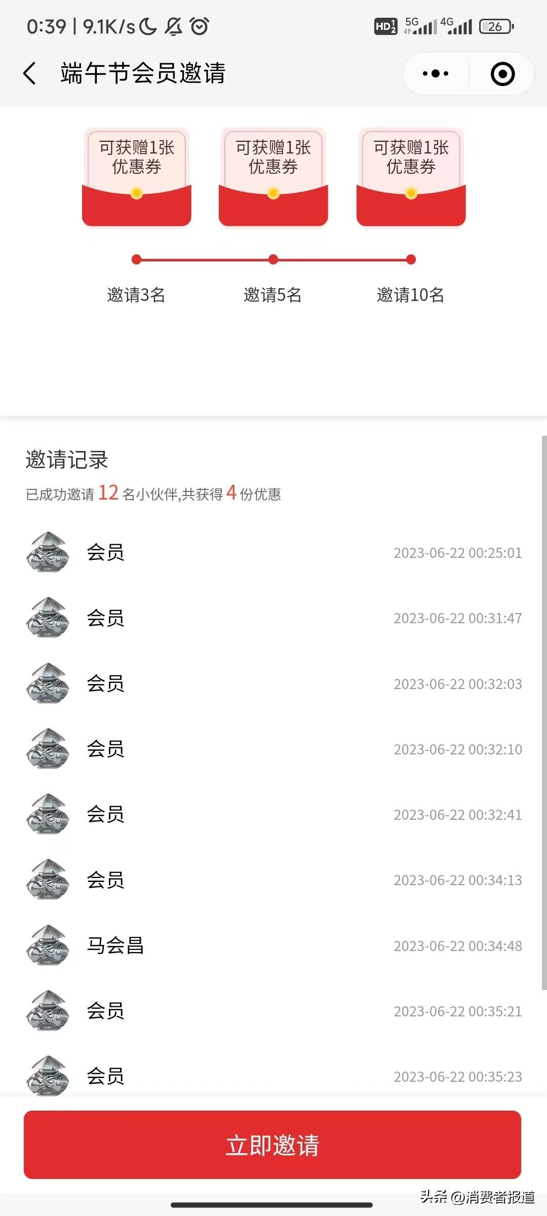 李菲的遭遇并非是个例,来自广西梧州的朱辉(化名)也有着相似经历。据了解,朱辉在6月22日凌晨时分参与了此次的拉新活动。“大半夜不睡觉,去找了12位好友注册新会员。”朱辉告诉消费者报道记者,其当天中午出发去蛙小侠店铺的路上发现免单券被收回。