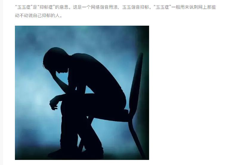 艾比在文中把抑郁症称作玉玉症,这种称呼乍一听有些新鲜可爱,但实际上它是用来讽刺网上那些动不动就说自己抑郁的人。
