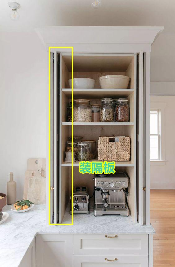 大家家里的橱柜上方经常会成为电器使用的空间,电器摆得越多,厨房也显得比较乱,打扫起来也不方便。安装这种柜门后,可以将吊柜和橱柜的空间都纳入其中,遮住凌乱的台面,同时也不影响台面的使用。