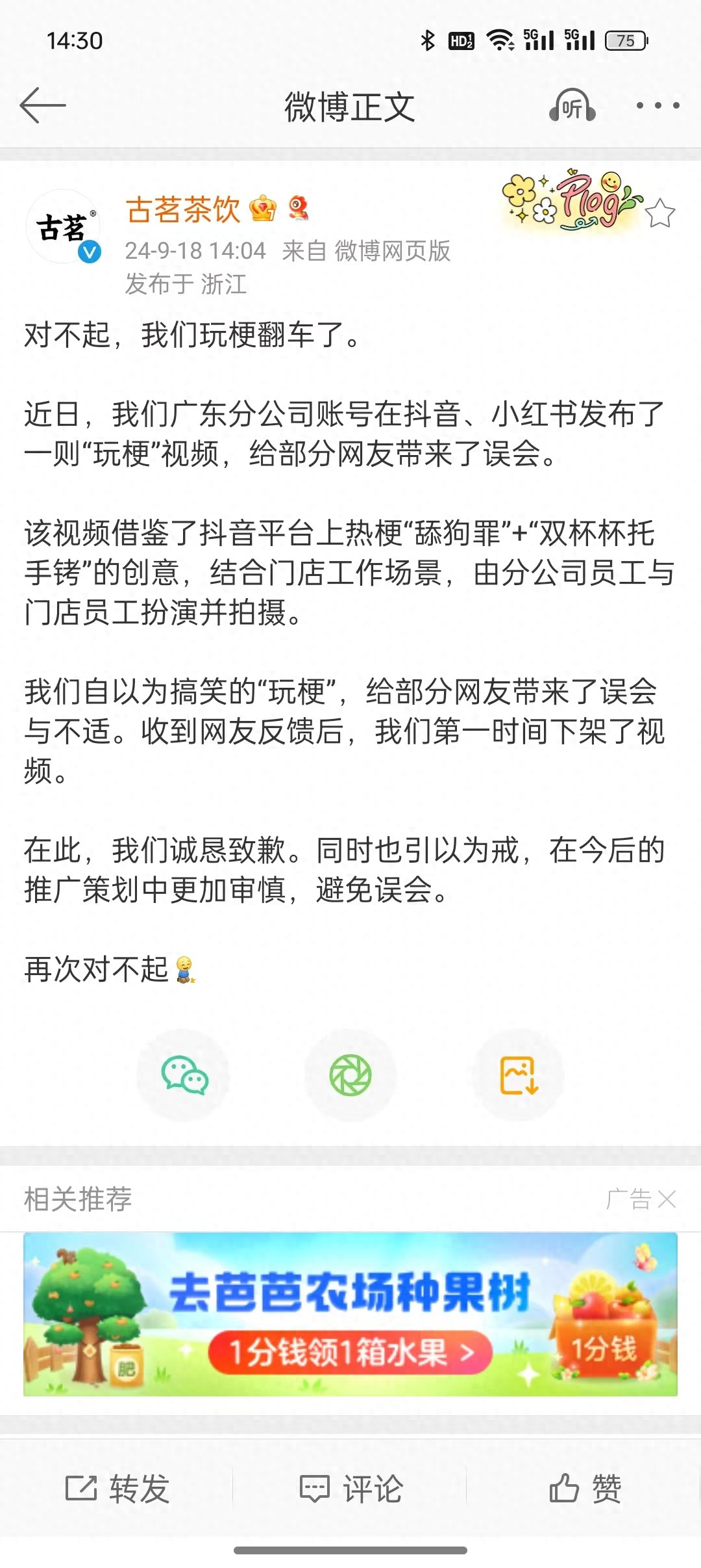 古茗致歉:玩梗翻车,已第一时间下架相关视频
