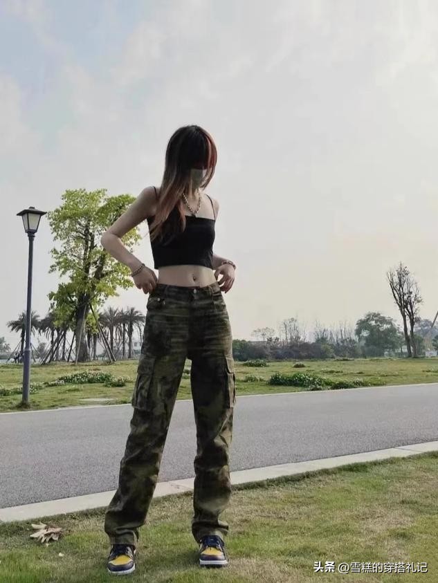 迷彩长裤搭配露肩的小吊带,清爽值up。小吊带不要太多设计,简单纯色的就很好看,搭配迷彩更容易。