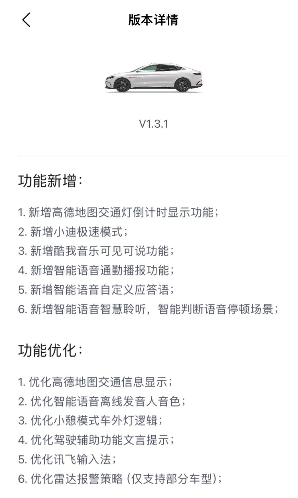 在功能优化方面也有6项提升,分别是:优化高德地图交通信息显示;优化智能语音离线发音人音色;优化小憩模式车外灯逻辑;优化驾驶辅助功能文言提示;优化讯飞输入法;和优化雷达报警策略(仅支持部分车型,具体车型不明)。