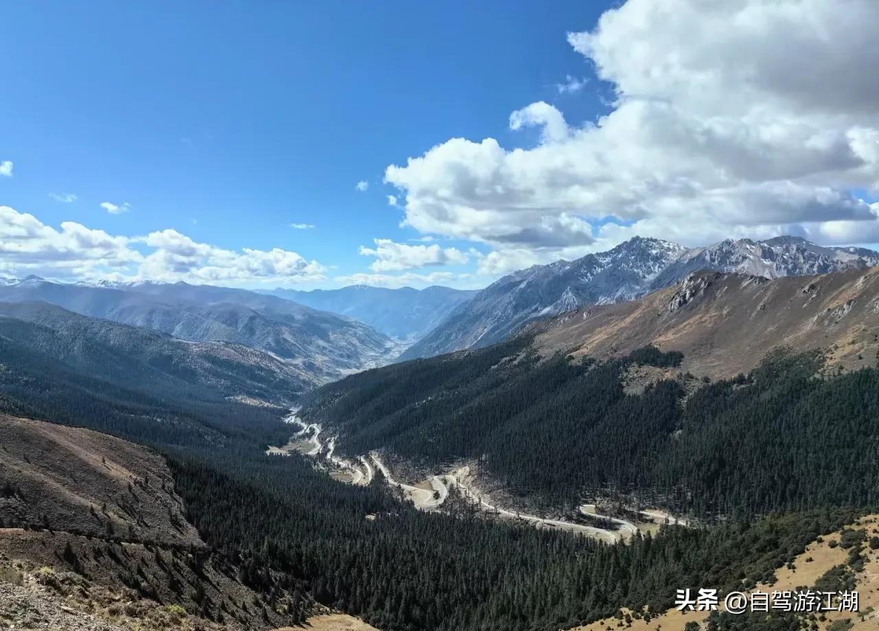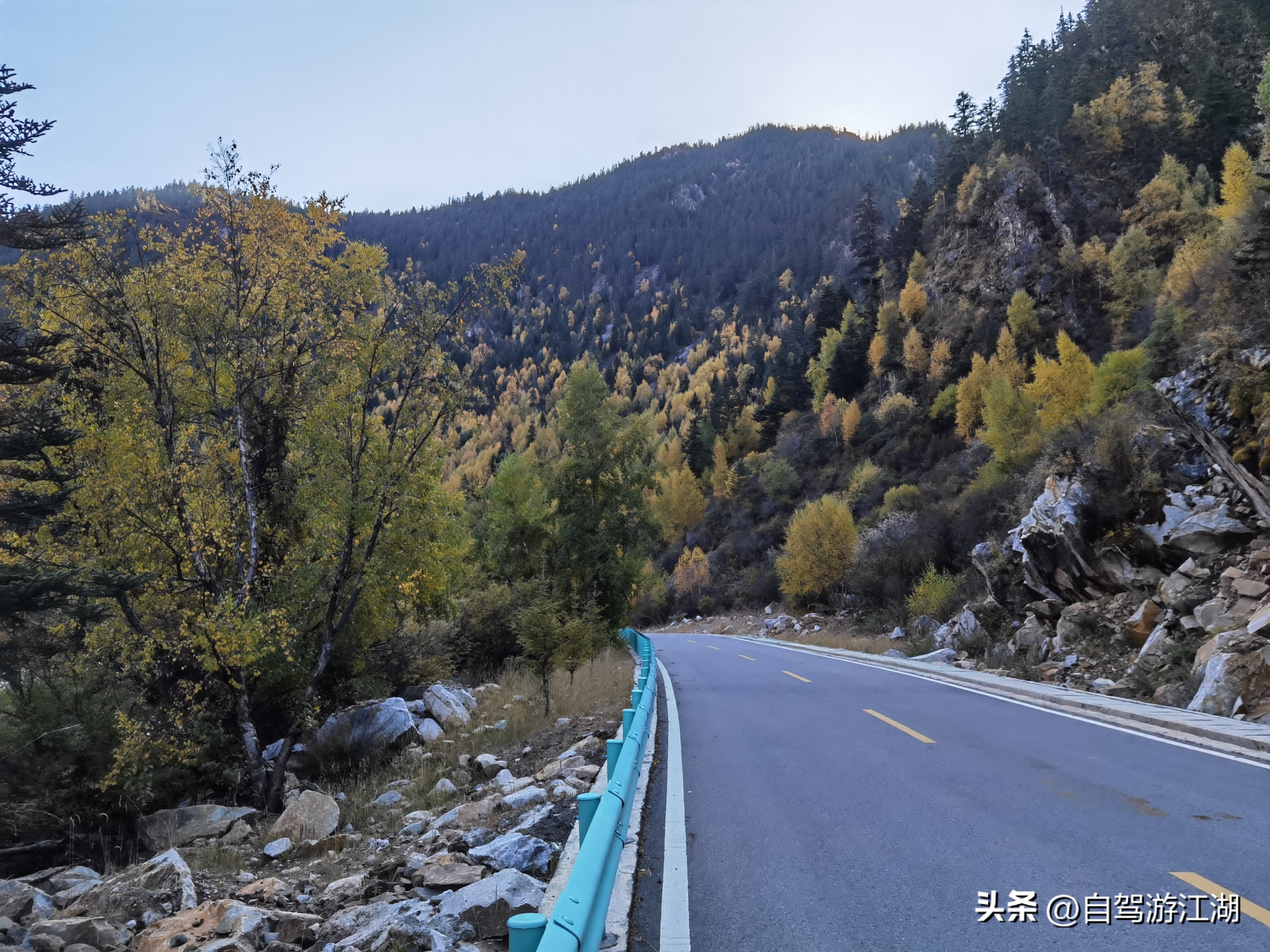 翻过扎瓦拉垭口后,459省道路况非常完好,道路也没有刚才那么曲折,可以一边轻松地开着车,一边欣赏车窗外的蓝天白云,路旁的秋色。