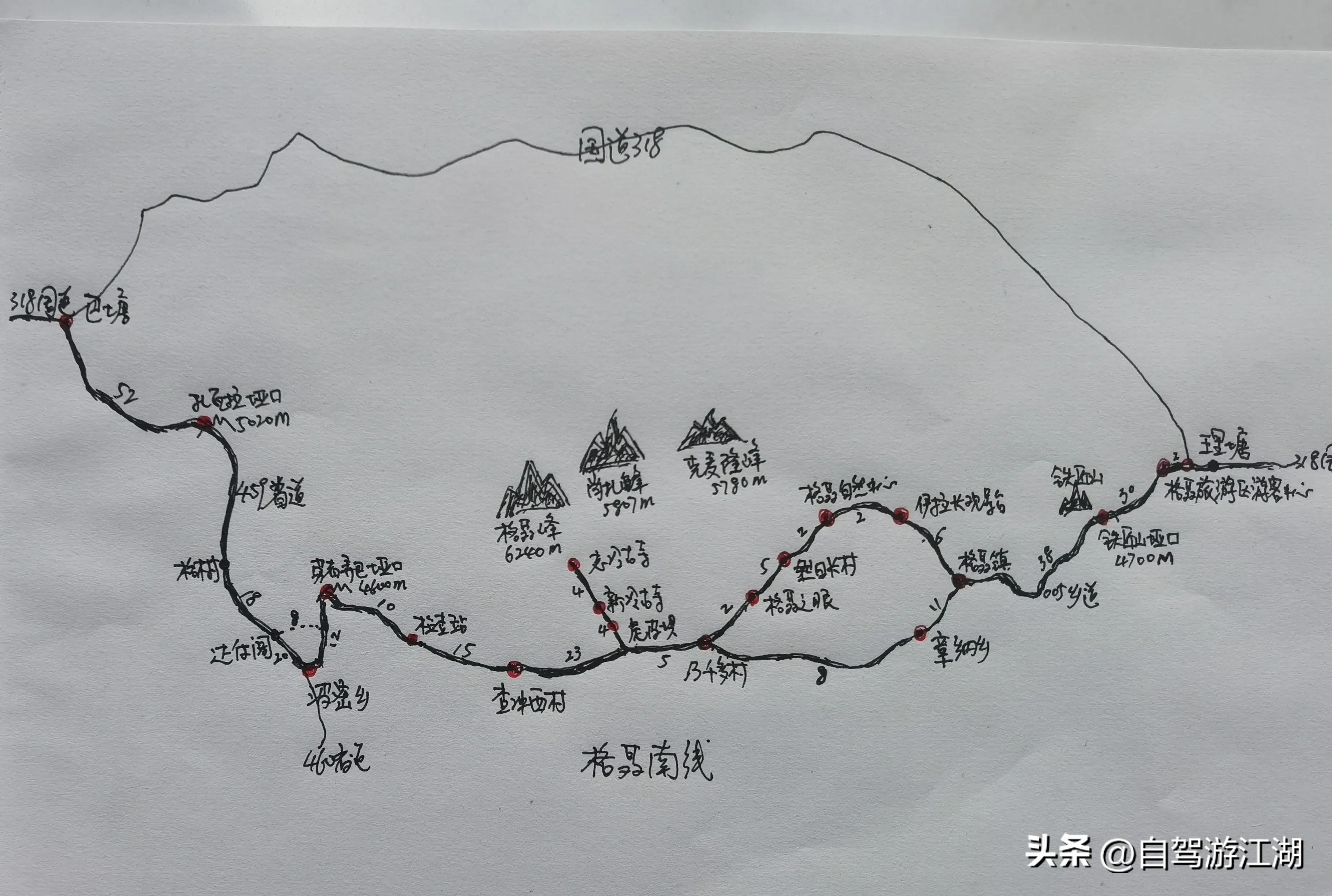 在十月中旬,我和同伴就用两天半的时间完成了从巴塘出发,经格聂南线到理塘的穿越,路线整理如下,希望对大家有所帮助。(手绘路线图,多多指正)无论正向还是反向穿越,你都要先下好甘孜地区的离线地图,随身还要带上足够的现金,因为在整个格聂南线路程中,大部分时间和地区都没有手机信号,如果有最好是带上那个“遥遥领先”的东西。
