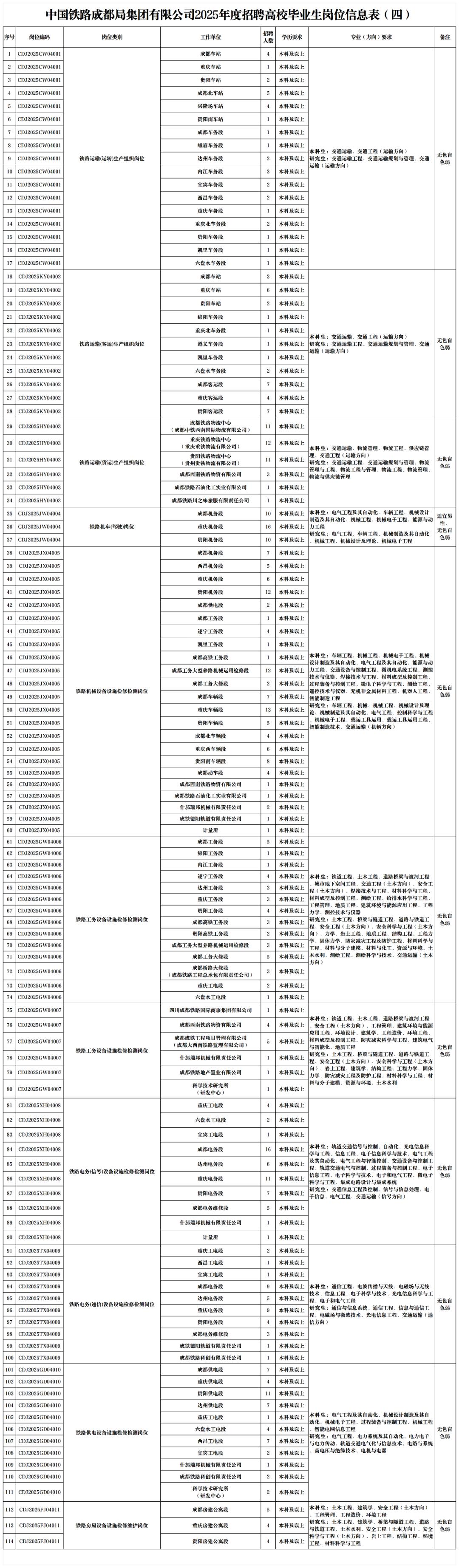 4.身心健康,具有良好的心理素质,辨色力正常无色盲色弱,听力、视力良好,具备正常履行岗位职责的身体条件,符合招聘岗位职业健康规范标准。其中岗位编码为CDJ2025JW04004岗位,要求身体条件符合《铁路机车车辆驾驶人员健康检查规范》(TB/T3091-2019)规定标准。