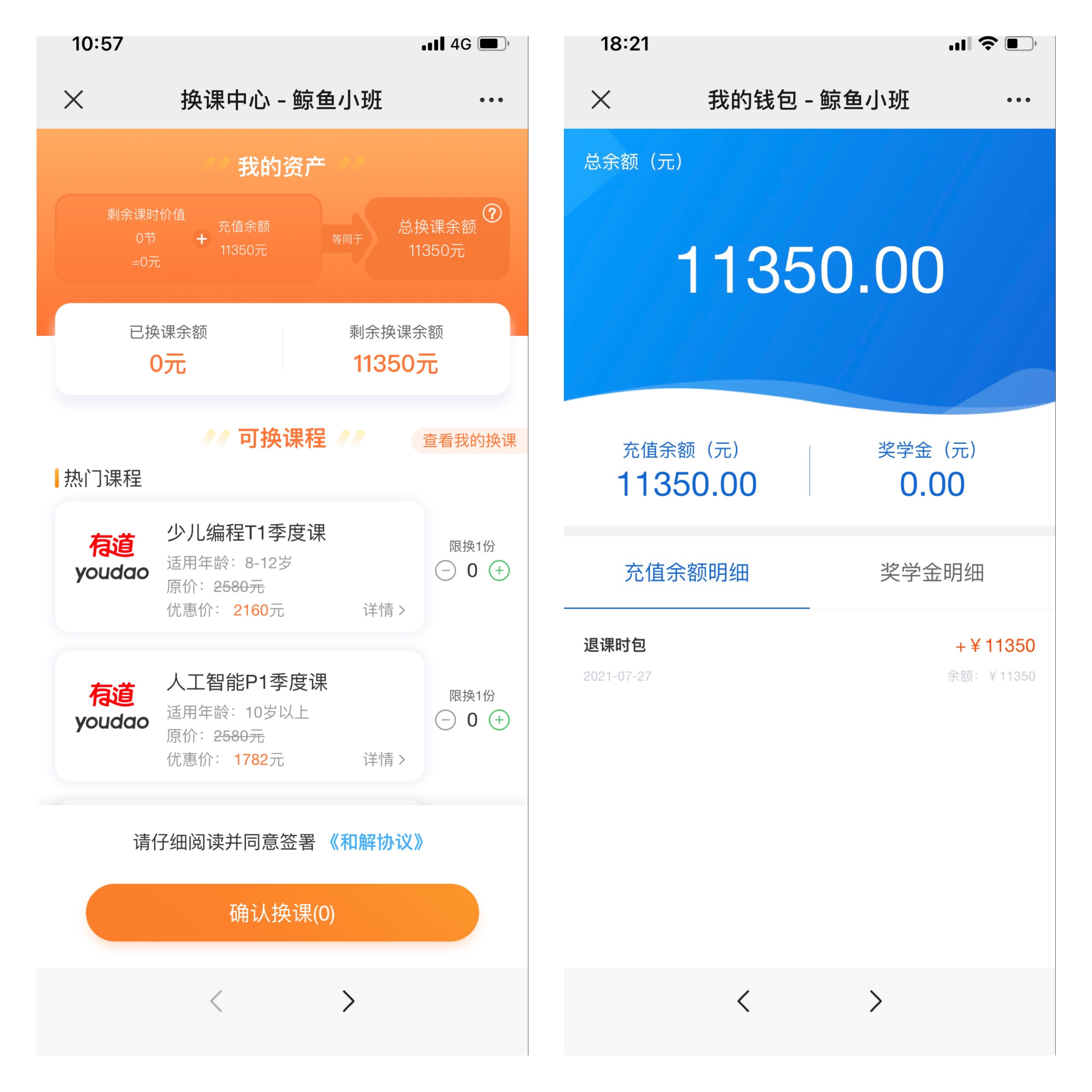 “换课余额”根据何种算法?在系统中的一份“和解协议”中称,用户购买大课时包(大课程包)后,如账户课时未消耗完的情况下申请退费,用户不再享受大课时包购买时所获得的优惠,退费计算方式需按当时鲸鱼外教培优出售单独或小课时包(含25课时)的课时单价计算已消耗的课时费用,即退费=用户账户总额-已消耗的全部课时×小课时包课时单价。“用户不得申请获赠课时退费,用户也无权通过折抵现金等方式变相要求获赠课时退费。”