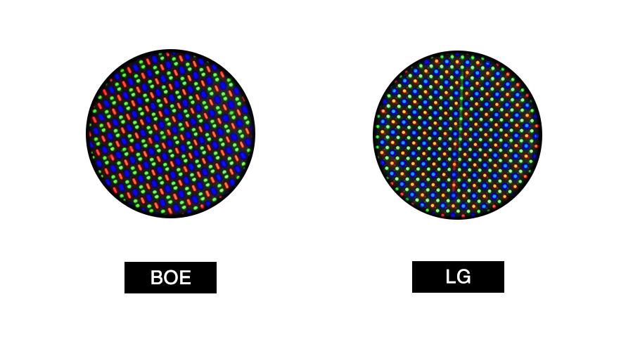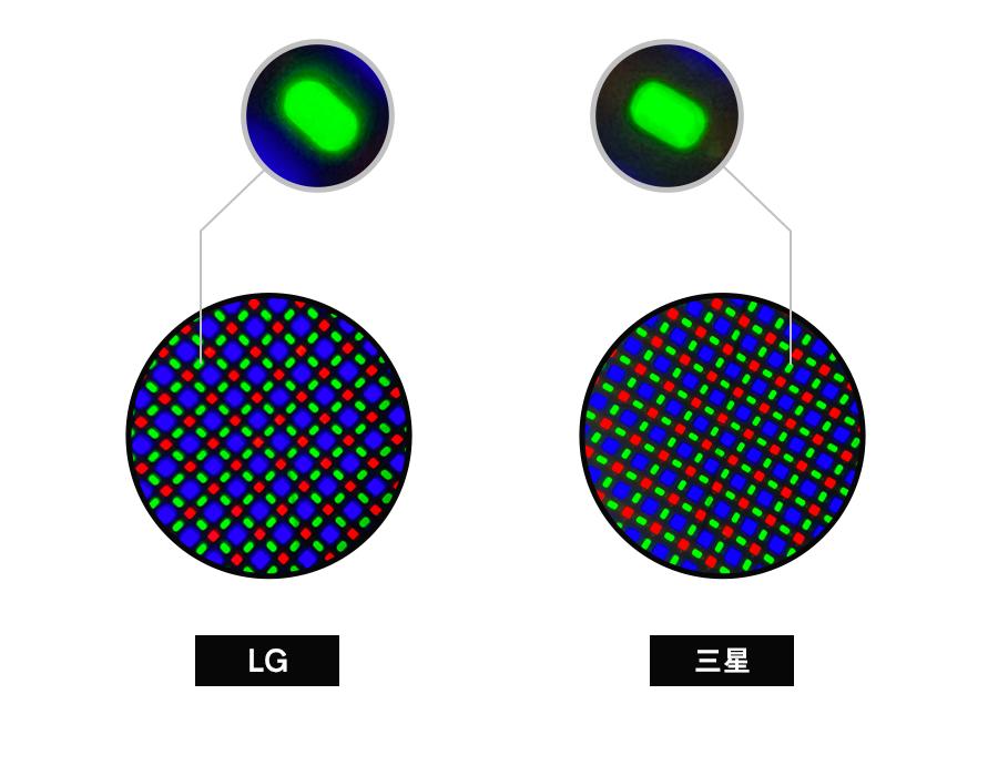 上面的像素图里,红色和蓝色次像素两者基本一致,只有在绿色上,三星稍微偏圆角矩形,LG 稍微偏椭圆,如果不是非常仔细地去看,是很难发现的。